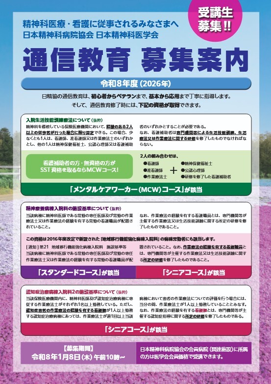 - 2026-01-15 日精協TOPICS 令和8年度 日本精神科医学会 通信教育 受講生募集のご案内